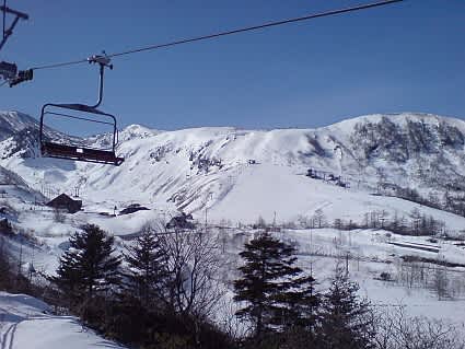 0802221_2 今日は快晴です!空き時間にスキー場の偵察に行って来ました。・・・スキーをする口実でもある(・_・;)今日は殺生(セッショウ)クワッド上にて撮影。正面は青葉第一ゲレンデ。左の△屋根がロープウェイ乗り場で左上が白根エリアですね。(ちょっとわかりずらい?)今日はロープウェイ山頂駅までくっきり見えました。本当にいいお天気でした。