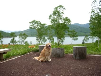 ウッドチップのじゅうたんを気持ちよくお散歩!丁度ツツジが満開でとっても素晴らしかったですよ。ここは標高が高いのでまだ一部に雪渓が残っていて、雪解け水が冷たくて(@_@)ノアくんも大満足♪ニジマスも釣れるよ!